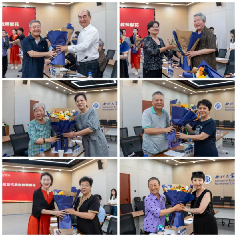 郭立宏、马葵、钟斐、谢西庆、刘明、王庆华六位校友向老师们献花。