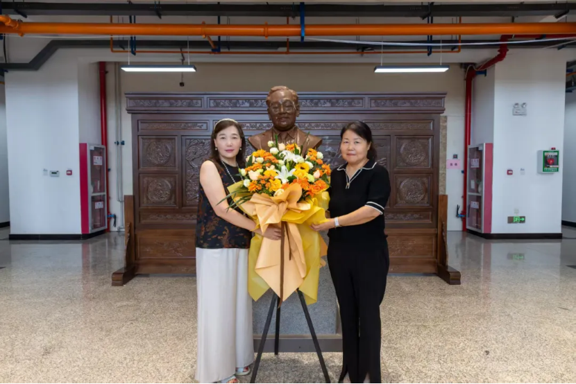 校友代表马晋红和寇雅玲为何炼成先生敬献花篮