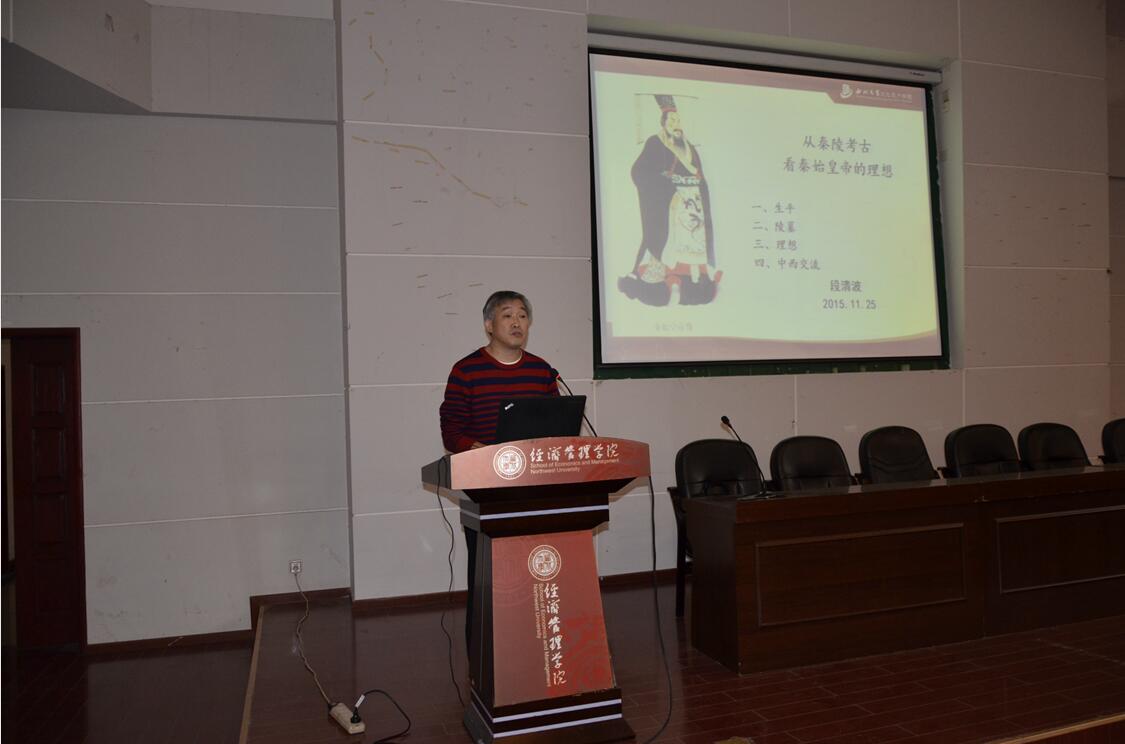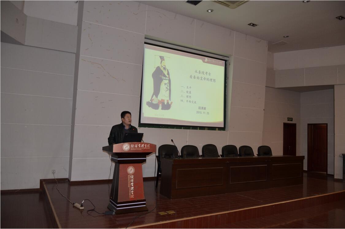 11月25日下午4时,我院“学问与人生”学生素质教育系列讲座第十五讲在金海恒业报告厅举行,本场讲座邀请了西北大学文化遗产学院教授、博士生导师段清波为我院学生作了题目为“从秦陵考古看秦始皇帝的理想”的讲座,讲座由院党委副书记李一凡主持,学院师生共计260余人到场听取讲座。